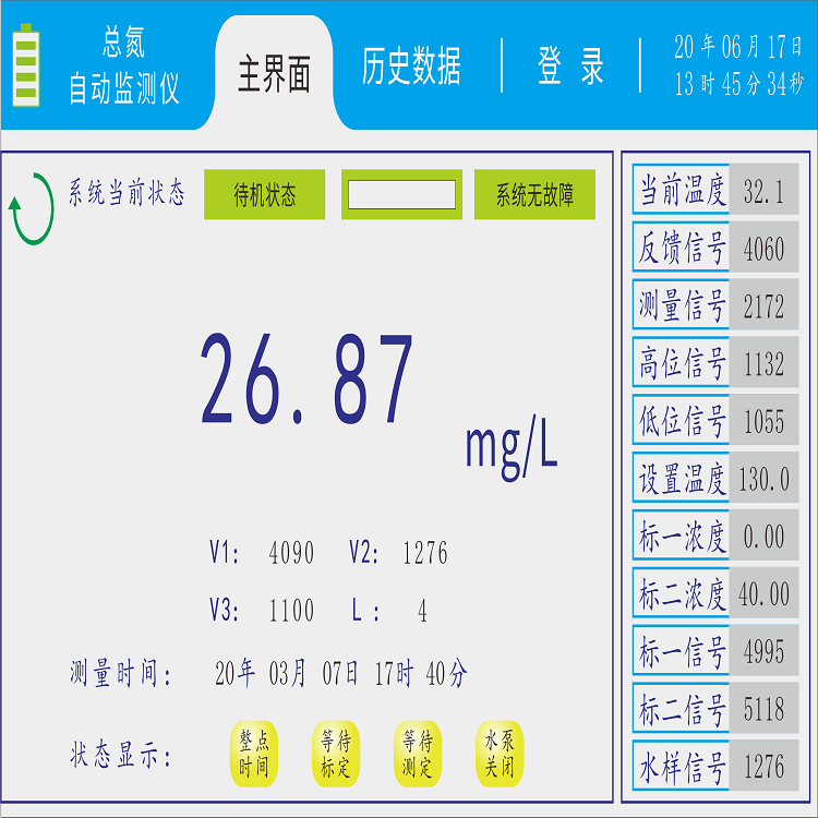 水样与调节剂混合后,样品中的硝酸银在酸性环境和指示剂存在的情况下,与指示剂反应生产一种带色络合物,分析仪检测此颜色的变化,并把这种变化换算成硝酸根值输出来。生产的带色络合物量相当于总氮量。适用于生活污水、工业废水,化工、电镀、养殖、印染、医院水处理工程等等行业污染水质中的总氮含量测定。