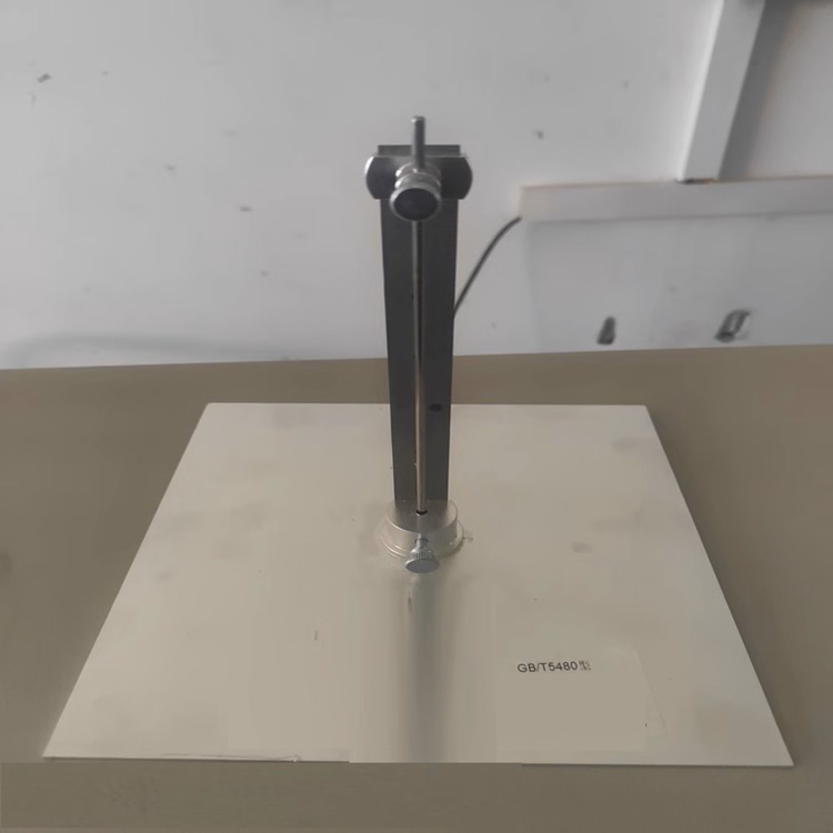 将被测试样平整放在硬质平板上,松开测针底部的拧紧螺母,将仪器轻放在被测试样上,慢慢将测针插入被测试样中,直至底部,看刻度尺指针滑块平行处所指厚度,即为被测试样厚度。