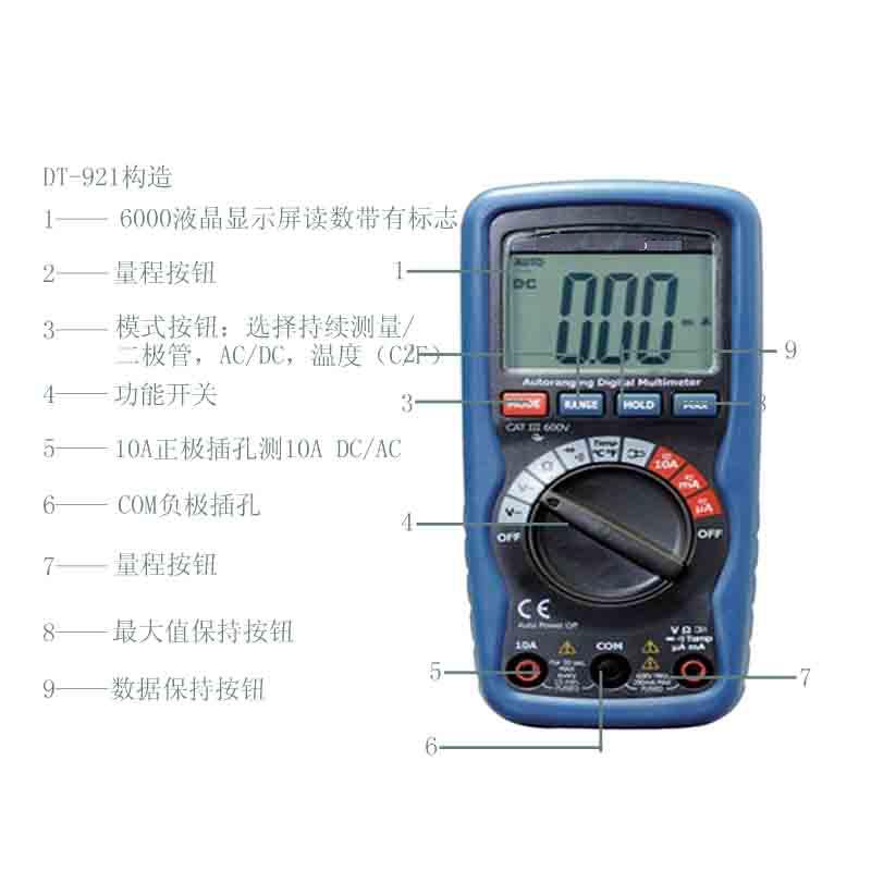 DP-921具备了安全外壳设计和超大液晶显示屏,为更加安全的测量提供了保障. 这款表集合了精确度高、使用便捷,安全可靠的特点,符合CAT III 600V安全指标.